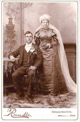 During Queen Victoria’s 63 year reign which constituted the Victorian era from 1837 to 1901, her husband, Prince Albert died. From that time, in 1861, she wore black. Honoring the Queen’s mourning , Victorian Brides chose to wear black wedding gowns as seen below. Notice what is in the hand of the bride. I believe it’s a bible or prayer book. This photo was taken in Illinois and would have been an upper middle class American around the 1860’s.